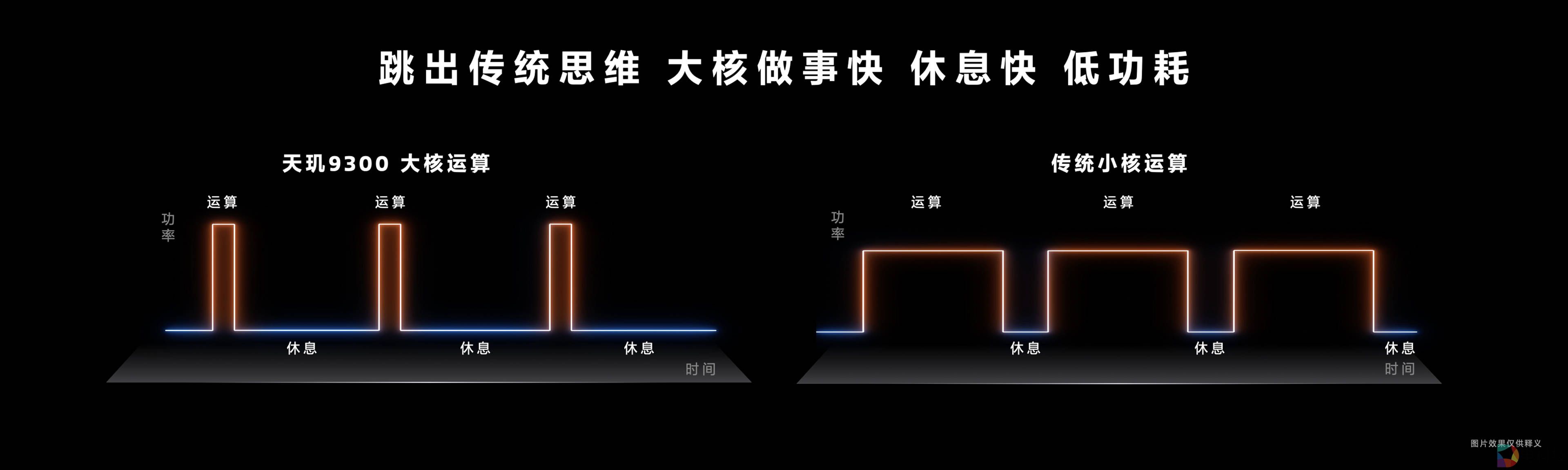 天玑9300则跳出传统,从“超大核、大核、小核”的组合,开创性地设计了“4个超大核和4个大核”的创新全大核CPU架构。而且,天玑9300的全大核和大核性能更强,通过更精准的调度策略,效率更高,从而可以更快完成运算,更早“休息”,实现性能和能效的提升。