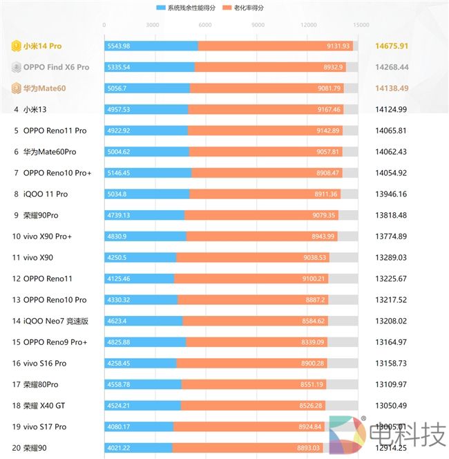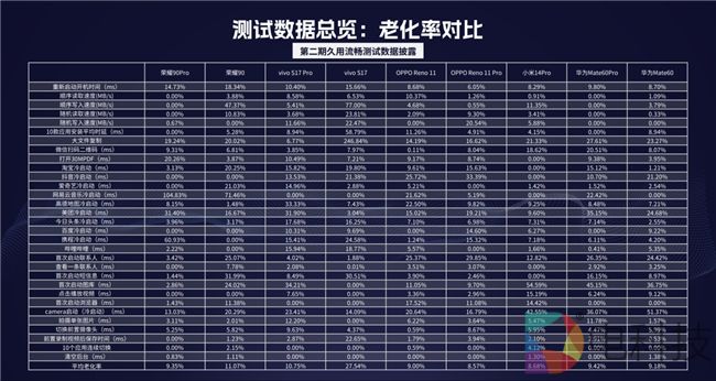相反,这次测试表现最过优异的是硬件配置并不具备优势的OPPO Reno 11系列。虽然其并未在很多项目中取得最好的成绩,但凭借全场景稳定的表现以及靠前的成绩,以排名第一的老化率,着实肯定了OPPO Reno 11系列在流畅度和抗老化上做出的努力。