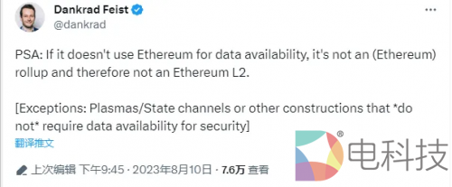 在Celestia暴火后, V神曾暗示“以太坊的layer2项目必须要在ETH上使用data availability”。 随后以太坊基金会成员Dankrad Feist也发表了言论。他指出,不采用ETH作DA层(数据可用性层)的不是Rollup,也不是以太坊Layer2。
