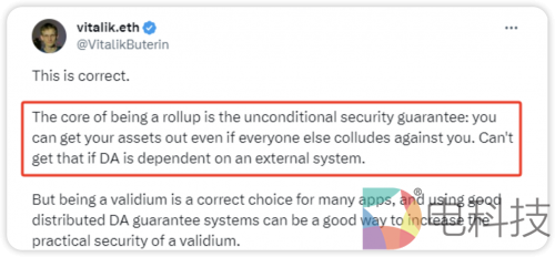 随后V神在他的推特流的一次回复中表示“ being a validium is a correct choice for many apps, and using good distributed DA guarantee systems can be a good way to increase the practical security of a validium"