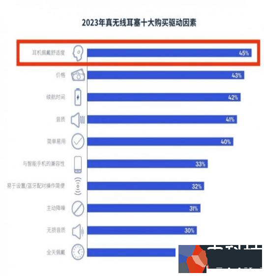 市场繁荣之下,反映了用户关注耳机的侧重点在悄无声息的发生变化。开放式耳之所以能够受到市场的强烈追捧,舒适度是这类产品打动用户最核心的因素。在高通发布的《音频产品使用现状调研报告2023》中,这一趋势再次得到了证实。在这份报告中,耳机的“佩戴舒适度”已经超越了价格和音质,成为了消费者选购耳机产品时最关注的要素。