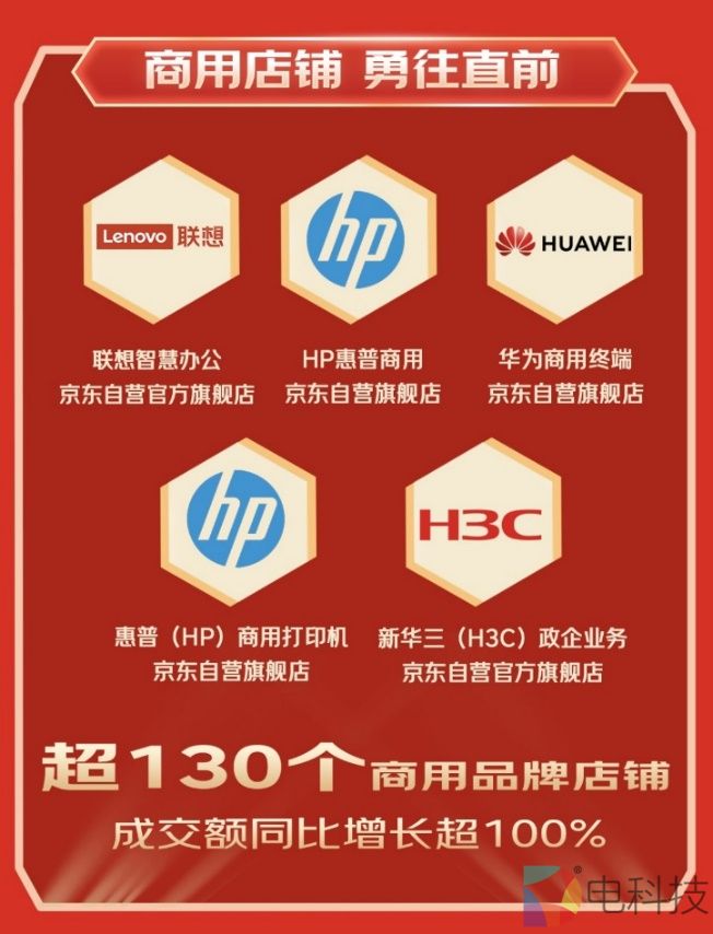各3C数码品牌京东自营旗舰店也凭借品质过硬的产品以及省心服务,取得了不俗成绩。战报数据显示,超130个商用品牌店铺成交额同比增长超100%;其中,联想智慧办公京东自营官方旗舰店、HP惠普商用京东自营旗舰店、华为商用终端京东自营旗舰店、惠普(HP)商用打印机京东自营旗舰店以及新华三(H3C)政企业务京东自营官方旗舰店,均取得亮眼的成绩。