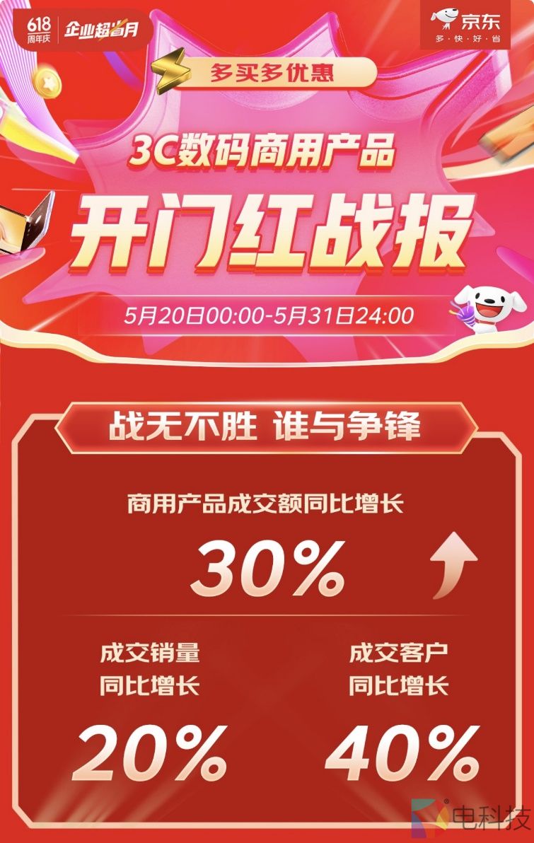 凭借又便宜又好的购物体验,本次京东618激发了客户的换新热情,京东3C数码企业及商采618再创佳绩。5月20日至5月31日,3C数码商用产品成交额同比增长30%,成交销量同比增长20%,成交客户同比增长40%;笔记本、打印机等品类销售纪录不断刷新,为客户提供了“多买多优惠”的全新采购体验。
