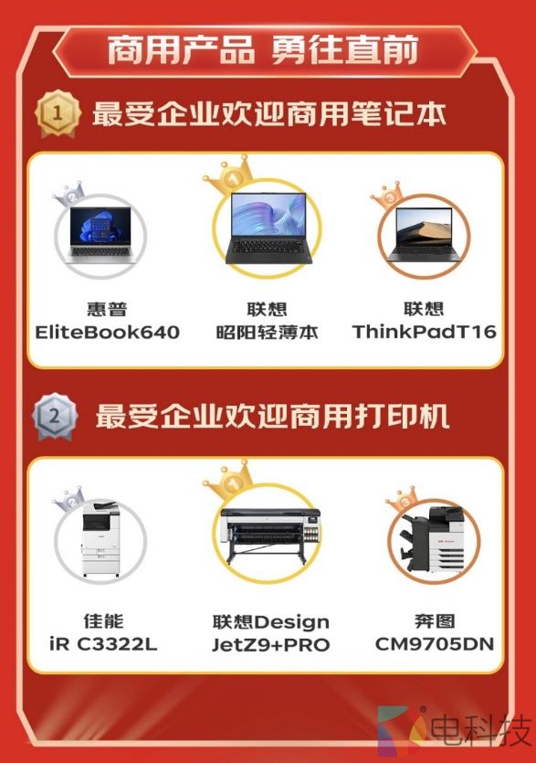 从战报中可以看到,今年京东618也涌现出了一大批深受客户喜爱的爆款产品。联想昭阳轻薄本成为最受企业欢迎的商用笔记本,惠普EliteBook 640笔记本及联想ThinkPad T16笔记本受欢迎度紧跟其后;最受企业欢迎的商用打印机TOP3分别为联想DesignJetZ9+PRO打印机、佳能iR C3322L打印机、奔图CM9705DN打印机。