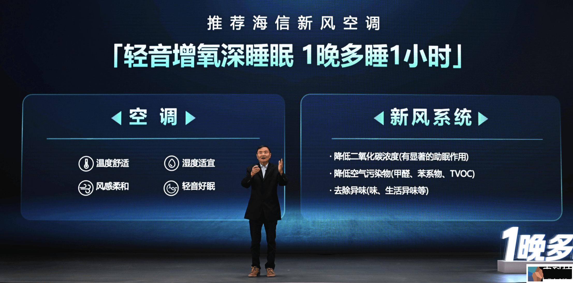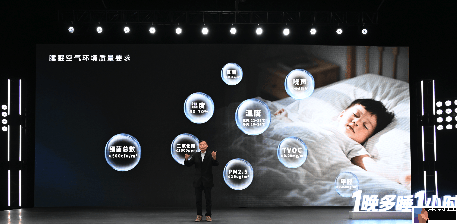 吴教授进一步阐述了环境优化的两个关键方面:首先,适宜的温湿度控制对睡眠和健康至关重要。海信新风空调通过温湿度精准控制、柔风防直吹以及16分贝呼吸般静音等创新技术,为用户营造出更舒适的睡眠环境;其次,控制室内污染物也是改善睡眠的关键。二氧化碳浓度是室内空气质量的最重要指标,其升高往往伴随颗粒物、细菌、装修污染物及异味等有害物质的增加,海信新风空调可以有效降低二氧化碳浓度,提供增氧好空气,从而改善睡眠环境,起到显著的助眠效果。