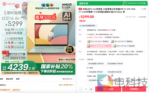 618年中大促叠加国家补贴政策,今年最香的一波换机机会来了!对于追求性能与颜值兼顾的年轻人,华硕a豆14 Air 悦享版绝对是这个购物节最值得入手的AI轻薄本之一,高颜值轻薄机身拥有三款多巴胺配色选择,直降500元,搭载AMD锐龙9 AI处理器、双AI助手,叠加至高20%国家补贴,到手仅4239元,更有白条6期免息、晒单返100元E卡等福利,实惠不容错过!