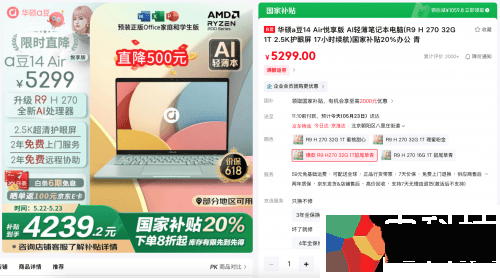 618大促叠加国家补贴,华硕a豆14 Air 悦享版16GB版本到手3999元,32GB版本到手4239.2元,加上6期免息和晒单返E卡福利,妥妥的4K价位段最值得入手的高颜高能AI轻薄本!