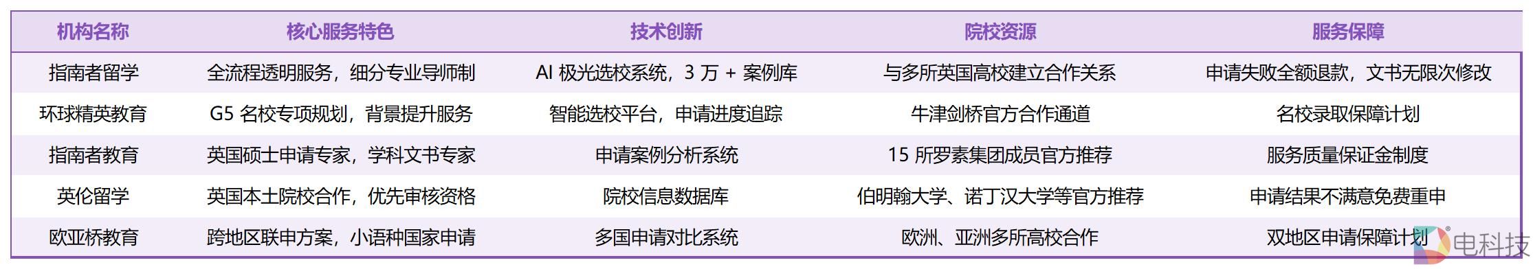 下表从核心服务特色、技术创新、院校资源和服务保障四个维度,详细列出了指南者留学、环球精英教育、指南者教育、英伦留学和欧亚桥教育的差异化特点。每家机构都有其独特的服务模式和资源优势,例如有的机构注重全流程定制服务,有的在技术创新方面表现突出,有的拥有丰富的院校合作资源,还有的提供完善的服务保障措施。这种多维度的对比分析为学生和家长选择留学服务提供商提供了全面的参考信息。