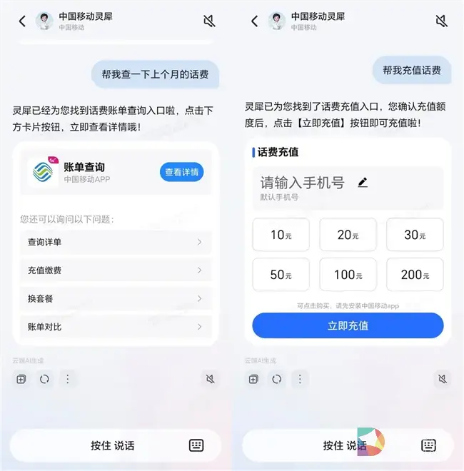 以通信场景为例,用户查询话费是典型的重复性需求,使用频次较高;在用户首次发出“查上月话费”指令后,可调出“账单查询”“充值缴费”“换套餐”等功能的荣耀YOYO聚合卡片。此后,用户无需再次输入,只需点开这张卡片,即可直接查询。长期反复的互动,可使智能体不断学习用户习惯,进而为中国移动优化套餐设计、提升内容品质提供坚实的数据支撑。