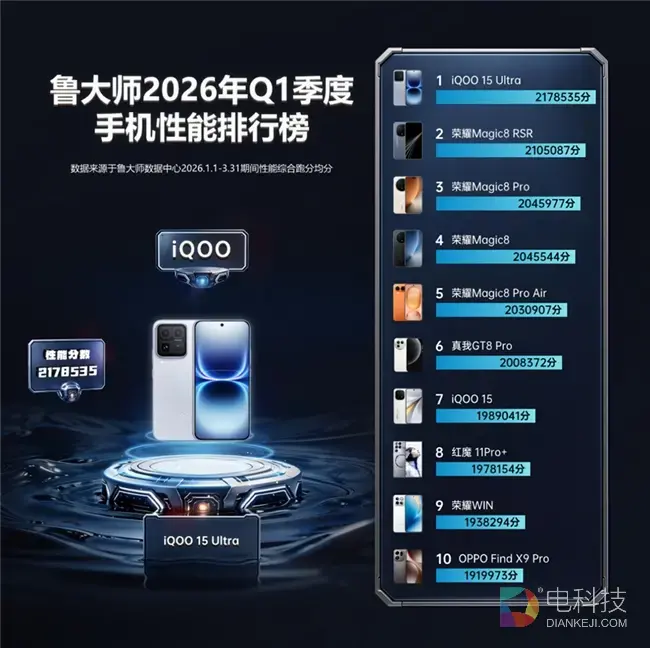 本季度的性能王座由iQOO 15 Ultra以2178535性能分夺得,这不仅是本季度唯一突破215万性能分的机型,也标志着iQOO在顶级性能赛道上实现了历史性突破。