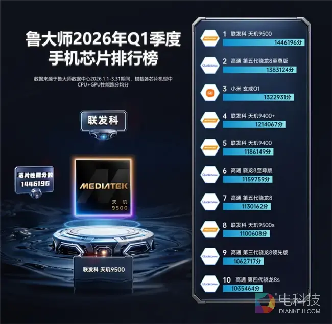 Q1芯片性能榜迎来了历史性时刻,芯片市场的竞争已进入深水区,联发科凭借天玑9500的卓越表现,成功在顶级性能领域反超高通骁龙旗舰芯片,而小米的自研玄戒芯片也已成为一股不可忽视的稳定力量。