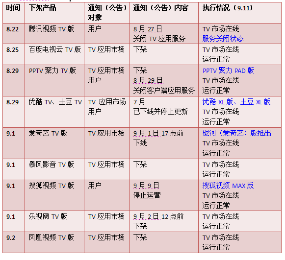 从8月22日到9月2日,仅仅8个工作日的时间,有9个网络视频的APP TV版宣布下架,基本涵盖了那些影响力最大、知名度最高的企业。然而,9月10日,爱奇艺携银河版强势回归TV市场,而此前优酷视频XL版、土豆视频XL版、搜狐视频MAX版、百度电视云等也都在各TV市场悄然现身。新版本一律强调是针对Android大屏设备,我们这是“皇帝的新装”实景剧么?
