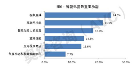 大多数消费者拥有智能电视之后还是用来看影视内容,近3成(24.6%)消费者认为智能电视最重要的功能是视频点播,视频仍然是智能电视最重要的功能。消费者对智能电视的最普遍需求是观看3D影片(73.3%),其次是“在线视频点播”(59.7%)和上网(49.3%);相较而言,消费者对内置应用软件商店、网络购物和手势识别功能的需求明显低于其他。