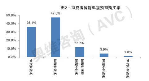 AVC调研显示,有近9成(83.6%)的消费者未来肯定或可能会购买智能电视,可见智能电视有着很大的市场潜力,这一结果说明,消费者对与智能电视有很强的的接受能力,智能电视市场前景较好。就消费者对智能电视的期望价格来说,支付意愿集中在5000-8000元之间,相当于普通电视的价格。46寸以下的彩电产品不再是电视尺寸选购的主流,而46寸-55寸的消费需求呈明显趋势,占比51%以上。