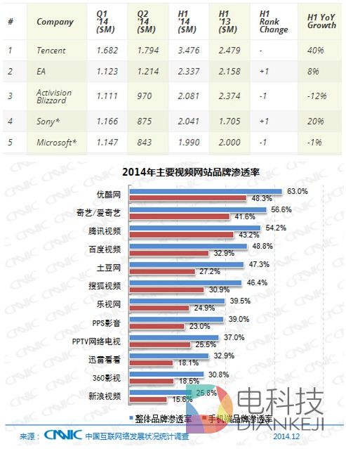 最后,腾讯的视频、游戏等服务能力可以完美同步到智能电视上。据CNINIC数据,截至2014年底,腾讯视频的品牌渗透率已经排名业界前三,已经超过了50%,与优酷和爱奇艺的差距很小。值得注意的是,腾讯视频在移动端的表现是强过气整体表现的。而艾瑞2014年发布的一组数据,则表明腾讯视频的月度覆盖人群已经超过了爱奇艺、优酷,成为行业第一。在游戏方面,腾讯的实力更加强大。Newzoo发布的报告显示,全球上市游戏公司收入榜,腾讯位居第一。而智能电视在互联网视频和游戏这两大关键领域,目前都处于待开发的阶段,坐拥如此之大优势的腾讯,一旦进军智能电视市场,视频和游戏将成为开疆拓土的两大利剑。