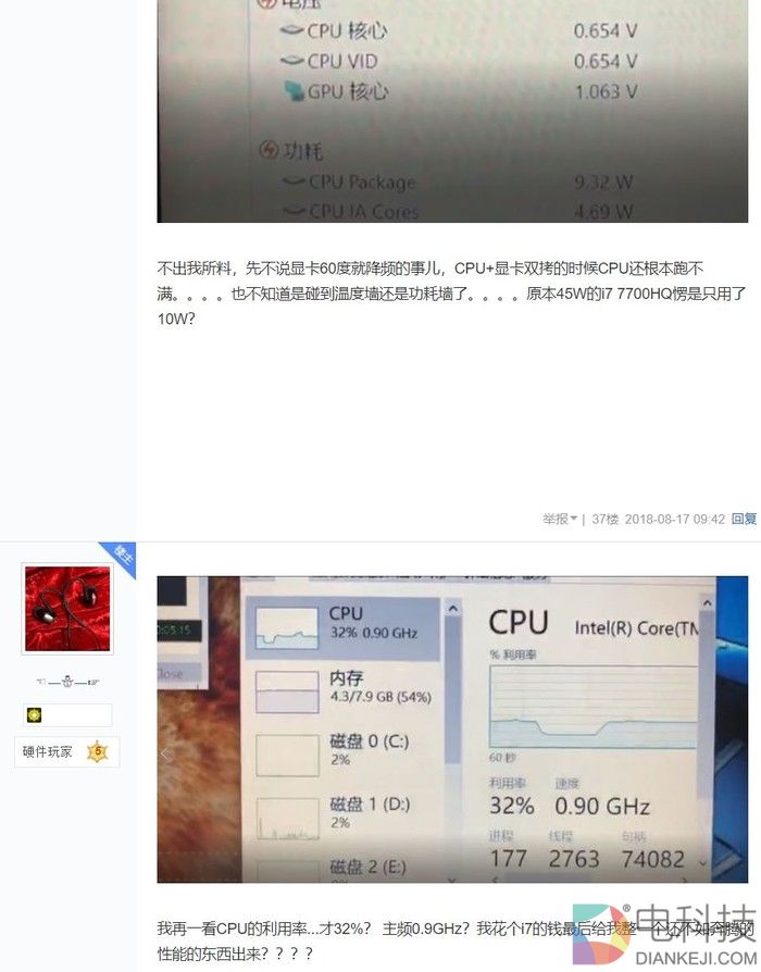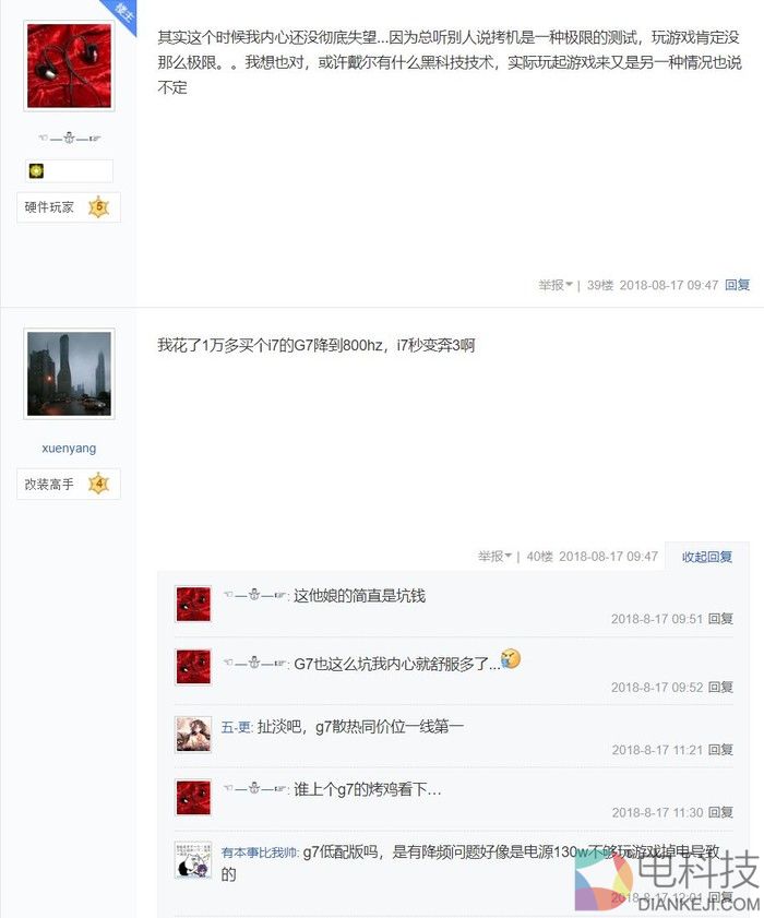 也有其他网友称:“花了1万多块钱买了一台戴尔G7游戏本,同样降频到800Hz,i7秒变奔3。”有网友跟帖解释说:“G7低配版吗?降频问题好像是电源130w不够导致的。”