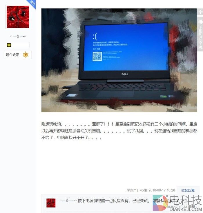 随后,该网友进行了游戏测试,但游戏还没打开呢,电脑就频繁地出现了蓝屏、重启的情况。几经波折之后,笔记本就再也无法开机,此时距该网友拿到这款新机还不足3个小时。
