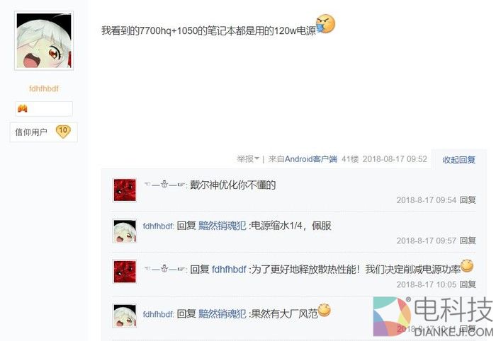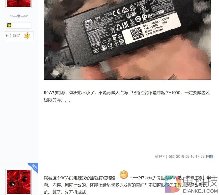 其他网友跟帖称:“我看到的7700hq+1050的笔记本都是用的120w电源”、“(戴尔)电源缩水1/4,佩服!”