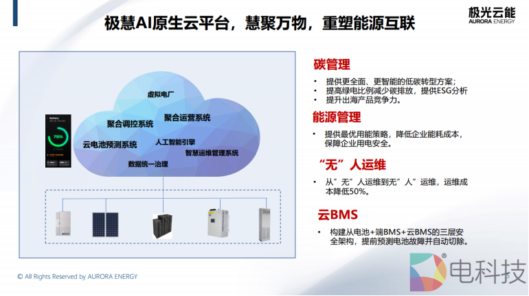 作为专注于全栈自研的极光云能,它将储能系统视作可在云端智能调度的设备,而非仅是边缘端的硬件基础设施。极光云能以其更智能的云平台,充分发挥储能调节功能,实现了从被动到主动、从简单到智能、从集成到重构、从分散到聚合的转变。