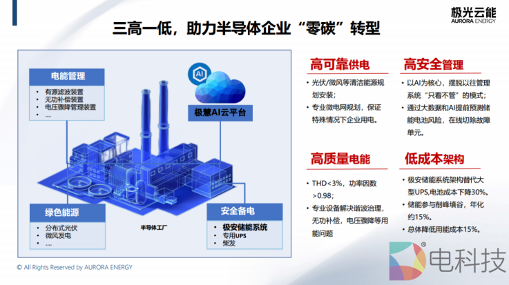 据黄彬博士介绍,极光云能解决方案将以电能质量管理、极安储能系统、光伏微风等绿能设备,保障高可靠供电、高质量电能以及低成本架构;而在极慧AI云平台的协同之下,可令工厂摆脱以往“只看不管”的管理模式,真正实现从“没有人运维”到”不需要人运维”的高安全管理。最终形成“三高一低”优势、助力半导体企业向“零碳”转型!