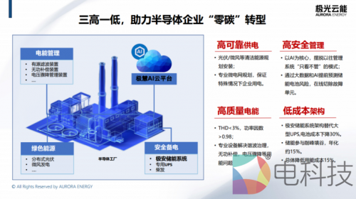 为破解以上难题,极光云能凭借自身的产研技术背景,推出了专为半导体等高端制造业打造的节能、降本、绿色、安全整体解决方案。该方案包括极安储能系统、光伏微风、极慧AI云平台、电能质量管理等绿能设备,实现了高可靠供电、高质量电能、低成本架构,将企业用电可靠度提升一个数量级、达到99.9999%。