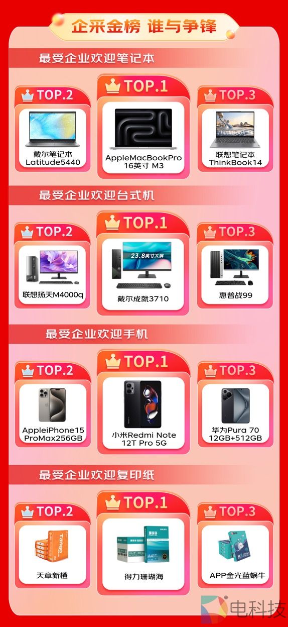 随着智慧办公模式的普及,中小企业对高效智能办公产品的采购需求不断增加,笔记本、台式机、手机等产品在京东618备受企业采购的欢迎。Apple MacBook Pro 16英寸 M3笔记本成为最受企业欢迎笔记本,戴尔Latitude 5440笔记本及联想ThinkBook 14笔记本受欢迎度紧跟其后;最受企业欢迎的台式机TOP3则分别为戴尔成就3710,联想扬天M4000q,惠普战99;此外,小米Redmi Note 12T Pro 5G成为最受企业欢迎手机,Apple iPhone 15 Pro Max 256GB及华为Pura 70 12GB+512GB则分别位于TOP2、TOP3;得力珊瑚海复印纸成为最受企业欢迎复印纸,天章新橙与APP金光蓝蜗牛复印纸也深受企业喜爱。