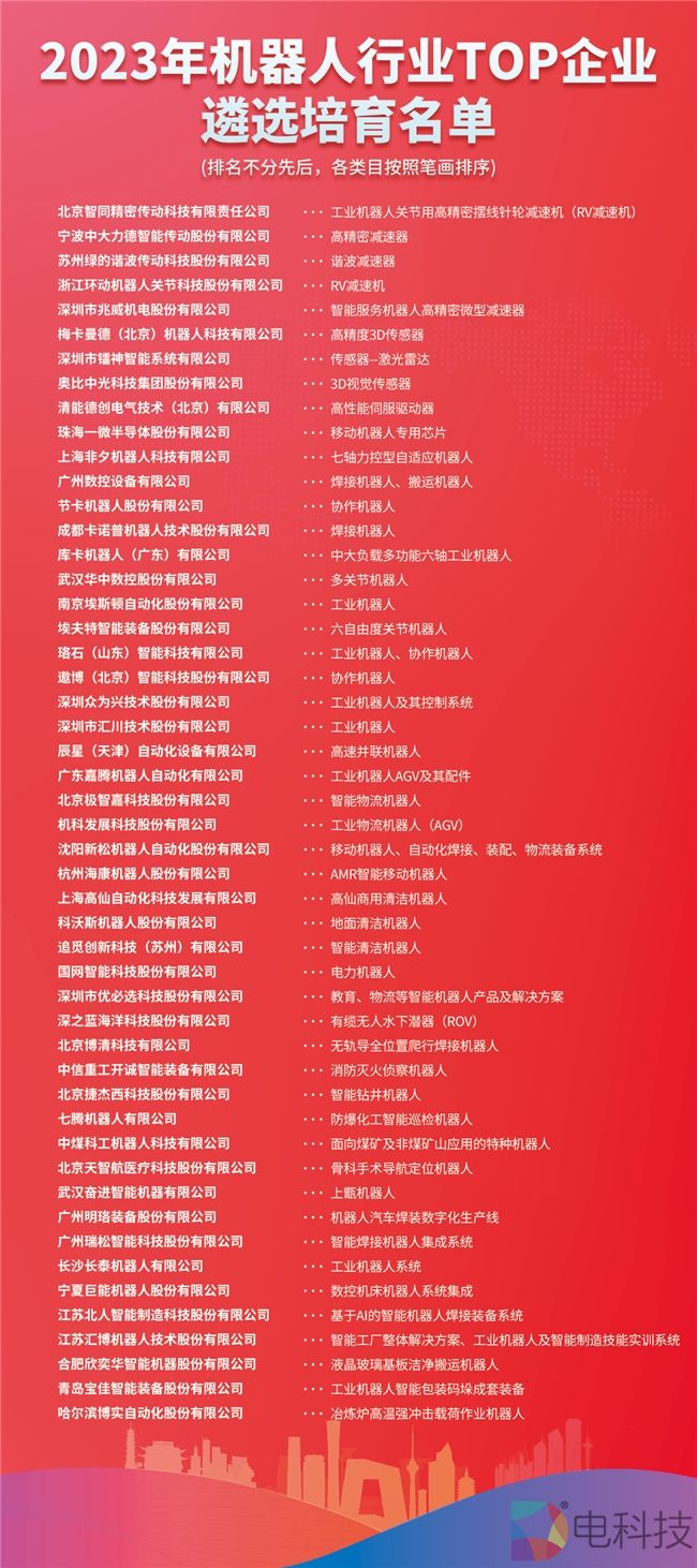 经过社会公示,会议当天,正式发布2023年机器人行业TOP企业遴选培育名单,包括覆盖机器人零部件生产制造企业、工业/服务/特种机器人整机生产制造企业、机器人集成应用企业共50家。