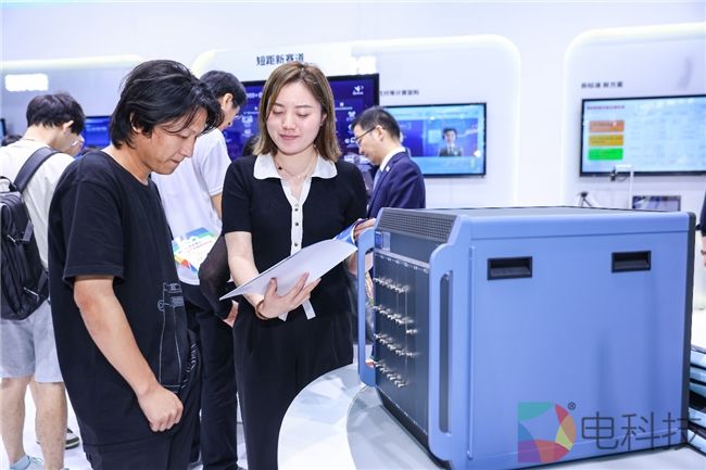 工作人员正向参会者介绍Flexwall-100高密度真实物理层仿真器的详细功能
