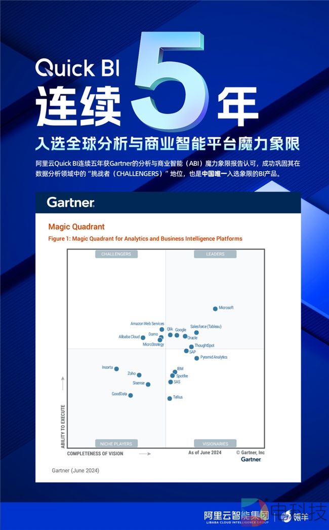 近日,阿里云宣布其凭借商业智能分析产品——Quick BI连续五年获全球咨询机构Gartner的分析与商业智能(ABI)魔力象限报告的认可。阿里云成功巩固在数据分析领域中