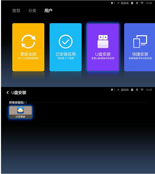 2、进入到小米电视2主界面后,找到“应用商店——用户”,进入就会看到“U盘安装”选项,直接进入点击apk,并根据提示完成安装即可。
