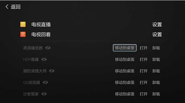 此外,除了目前的桌面类别外,如果我们希望自定义一些应用到桌面上,也可以通过设置完成。点击“所有应用”,能够看到安装在小米电视2上的所有应用,选择你希望添加的或者父母常用的应用,让家中的老人不用复杂的操作即可直接点击完成。