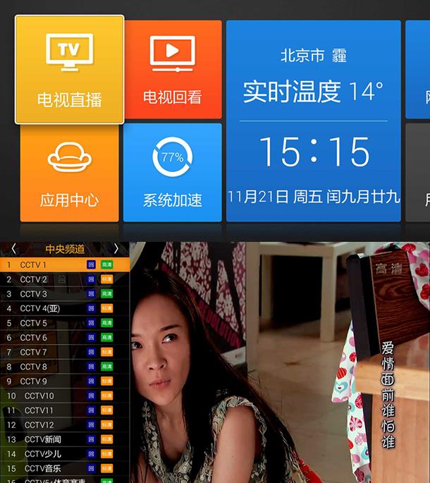 这时我们可以看到使用了“老人模式”后,界面上的图标都变的较大,包括电视直播、电视回看、应用中心、系统加速、天气、网络状况等等,清晰直观。而且对于上了年纪的父母来说是非常适合的,大图标更容易看清楚,没有过多的复杂界面,操作也是否简单。