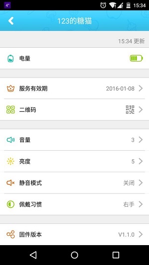 通过智能手机,用户可以查看“糖猫”儿童智能手表的电量,调节声音大小、显示亮度、左右手佩戴习惯等属性,一款“糖猫”儿童智能手表也能够支持多个家长。