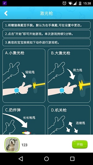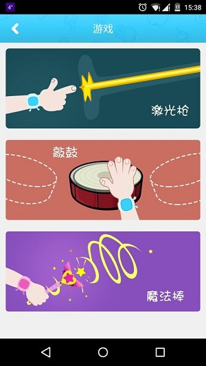 “糖猫”儿童智能手表看起来像是一件玩具,而在手机App上还真的提供了配合手表的游戏功能,通过手表上的传感器等感应装置,小朋友可以触发声音效果模拟激光器、打击鼓、魔法棒等小玩具。