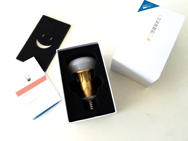 打开包装,揭开一个笑脸图案的保护层,身着“土豪金围裙”的微智X-Light Plus智能灯泡露出真容。
