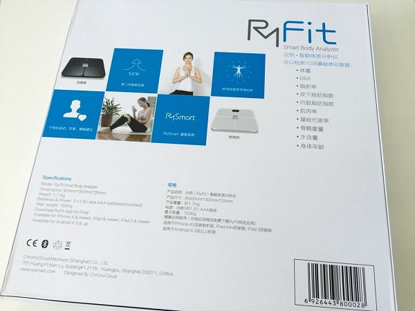 包装背面,我们能看到RyFit云悦智能体质分析仪可用于检测体重、BMI、脂肪率、皮下脂肪指数、内脏脂肪指数、肌肉率、基础代谢率等各种生理数据,不愧为“体质分析仪”。