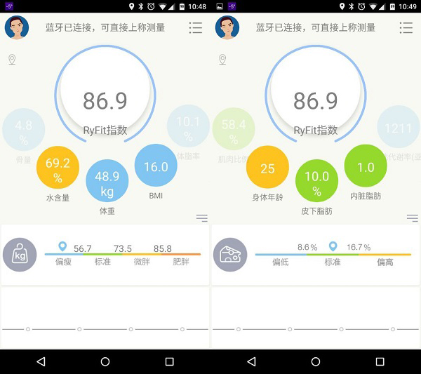 在设置好使用者的出生日期、身高体重等基本数据之后,用户通过App可以直观看到身体的水含量、BMI值、身体年龄、皮下脂肪含量等参数,并且还会给出一个数值偏高或偏低的指标性参考。