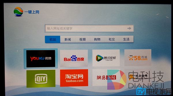 网址导航功能 列出了一些常用的网站,点击会自动调用浏览器。不过安卓原生浏览器在电视上使用很困难,因为并没有经过针对性设计,所以还是推荐使用第三方浏览器,如