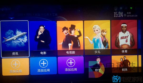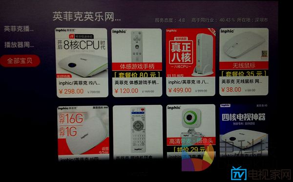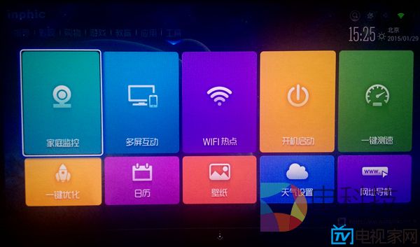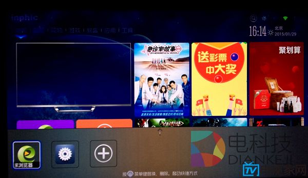 英菲克小馒头使用的是阿里云OS,我们在别的平台上也见过,所以整体风格上会比较熟悉。主界面有七大模块,分别是推荐、影视、购物、游戏、教育、应用、工具,涵盖面在目前电视的应用程度上已经算很全了。
