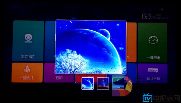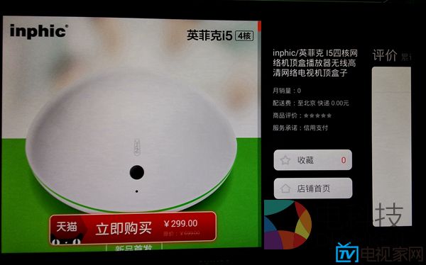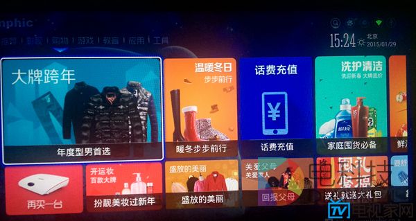 商品展示页面,目前电视平台的app大多处于起步阶段,界面看起来还比较基础,选框是一些线性排列的方块,颇有微软的风格。不过这样的操控方式确实很实用。另外付费的功能则是通过手机支付宝扫描二维码来实现的,其实笔者在PC端购物的时候也经常用手机来支付,所以使用起来不会什么问题;而家中父母这辈人通常都已经习惯了智能手机,只要稍加以引导对这种方式也不会有障碍。