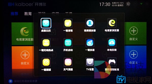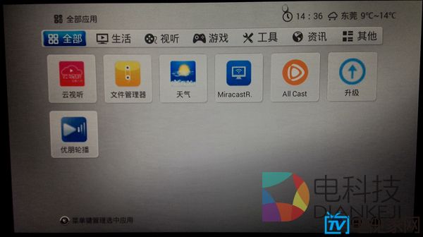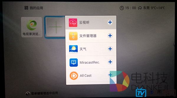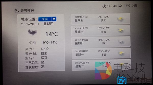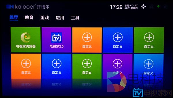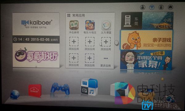 再说H8,H8上使用的KIUI是开博尔专门为自家盒子打造的界面,逻辑简单,没有太多复杂的功能,并且有着绚丽的过渡动画,甚至在主界面做了全屏的天气动画。比如今天外面下雨,你的屏幕上就会显示水滴特效,非常的有意思。不过缺少内容建设,比如应用、游戏以及最重要的视频内容都需要依赖第三方来提供,需要用户手动去解决。自由度高这件事很难说好与不好,见仁见智吧。