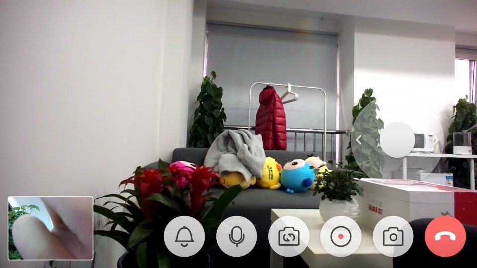 视频通话界面与一般在线聊天软件相似,支持声音开关、截屏、录像、切换摄像头等功能,而界面右侧的圆盘是用来调整小鱼在家主机屏幕和摄像头方向的。