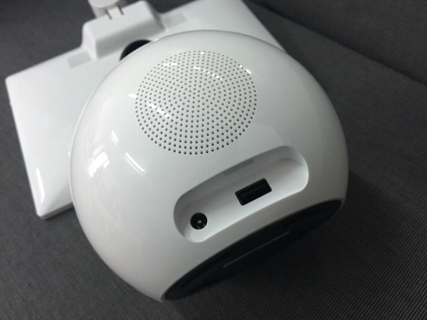 小鱼在家的扬声器设置在了背部,接口的安排上,除此了电源接口外,还具有一个标准USB接口。