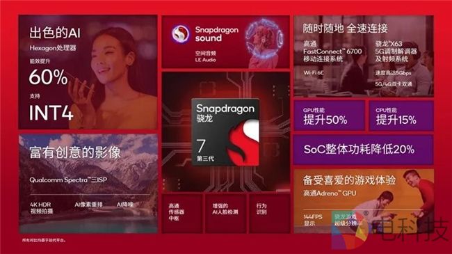 官方称,骁龙7 Gen3在CPU和GPU性能提升的同时,SoC整体功耗还降低了20%。