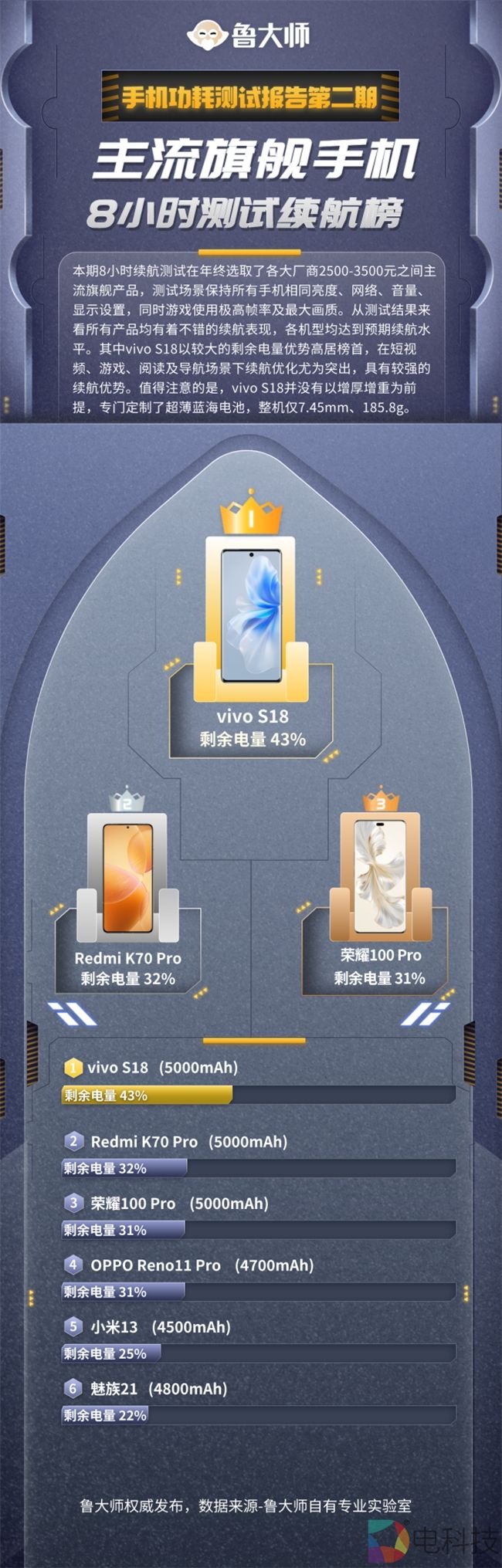 发布时间最新的vivo S18,最终以43%的剩余电量夺得了《鲁大师手机功耗测试第二期》的冠军。