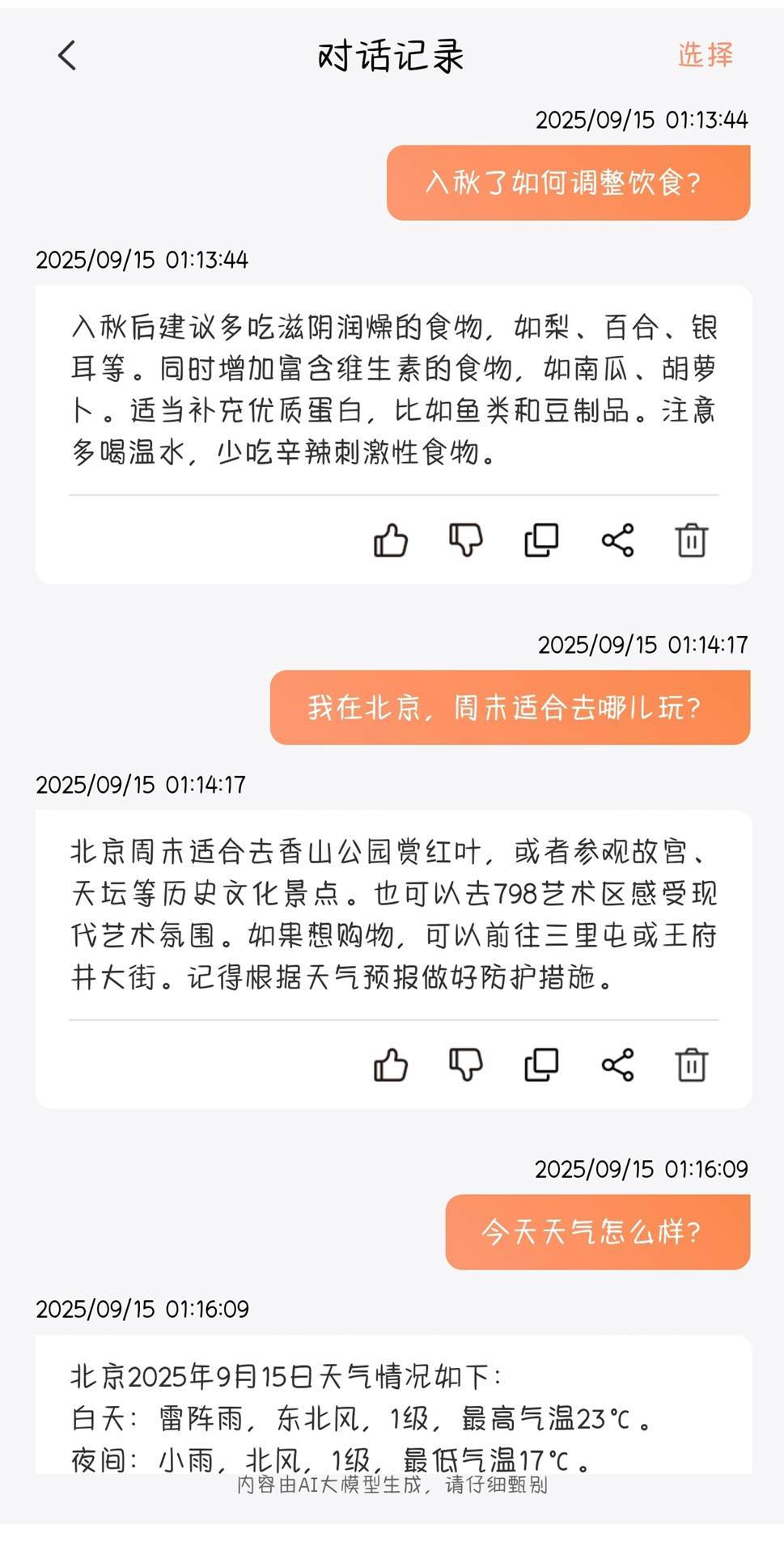 从实际体验来看,除了像传统语音助手那样询问天气之外,还可以让它给我们生活上的一些建议,比方说最近入秋了如何调整饮食、周末适合去哪里玩让它帮忙推荐出行地点之类。响应速度很快,唤醒后说出问题,然后很快就会给出相关的答复,对话内容会在App内同步记录方便后续随时查看,使用起来比较方便。