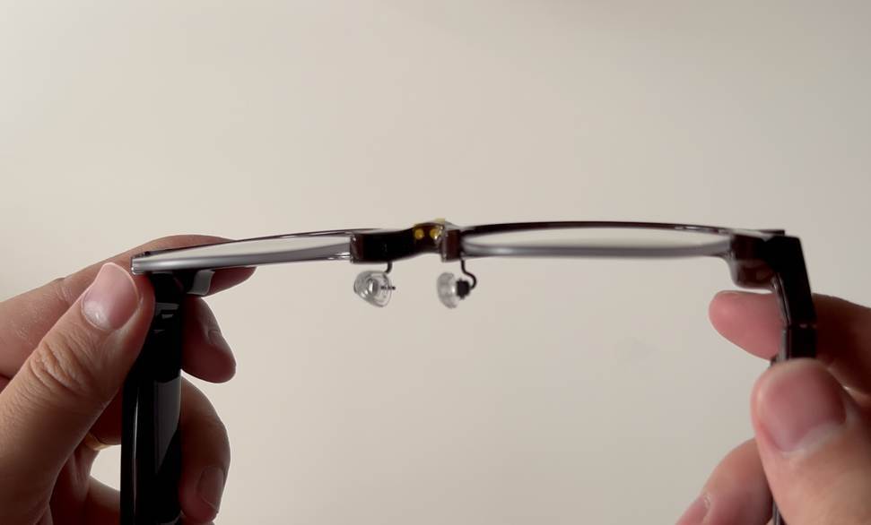 值得一提的是,充电触点设计在了眼镜鼻梁处,日常用手摘下、佩戴眼镜的时候不会磨损触点,同时也兼顾了视觉上的一体呈现。