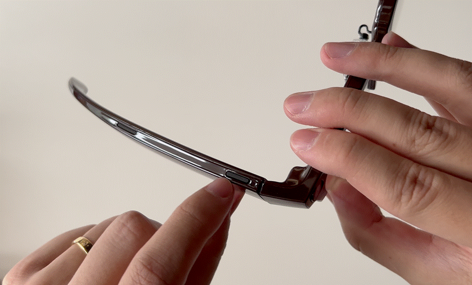 右侧镜腿上方设置有一枚拍照按键,在佩戴状态下可以很自然的用手够到。