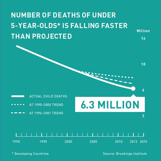 对我来说,衡量人类进步的最好方式之一,就是看看有多少儿童死于可以预防的原因。现在,能活着度过5岁生日的儿童比以往任何时候都多。到今年为止,全球儿童死亡率已经至少连续42年下滑。事态不仅向着正确的方向发展,速度也超出所有人的预期。《经济学人》今年9月发表的一篇文章估计,自2001年以来,全世界已经挽救了1360万儿童的生命。很难想象出还有比这更能象征社会进步的指标。