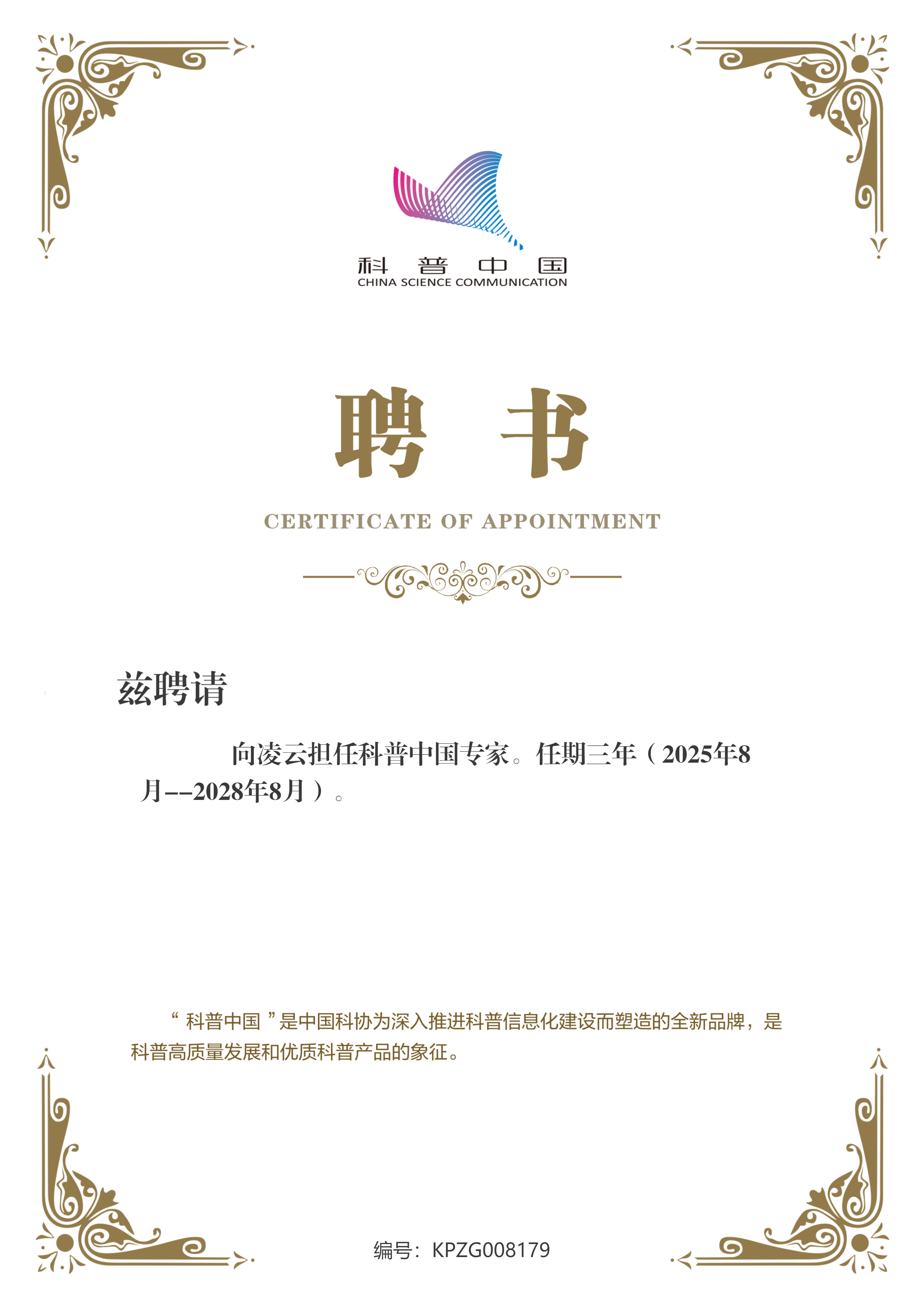近日,向凌云教授正式获聘为中国科协“科普中国”专家,聘期三年(2025年8月—2028年8月)。
